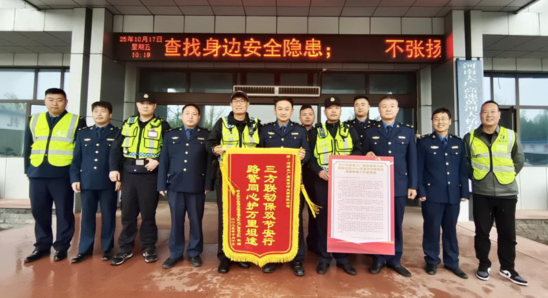 2025 年 10 月 17 日,新乡市公安局交通管理支队大广高速大队主要负责同志专程到访大桥公司,冒雨送来感谢信与锦旗,对公司在本年度防汛抢险及“国庆·中秋”双节保通工作中的突出贡献予以书面表彰。此次致谢不仅是对大桥公司在防汛关键期、国庆中秋双节保通任务中专业担当的高度肯定,更彰显了警企携手守护道路安全的坚实成果,为双方深化合作注入新动力。